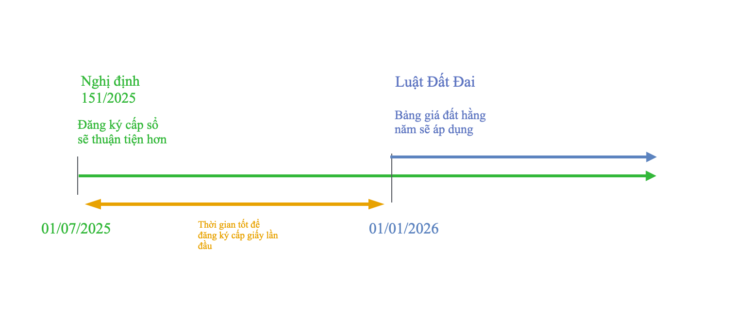 - Yếu tố sau 01/07/2025 – trước 01/01/2026: Không phải thực hiện bước xác nhận “không tranh chấp”, thời gian được cấp sổ nhanh hơn, vẫn được áp dụng bảng giá cũ khi đăng ký cấp giấy chứng nhận.